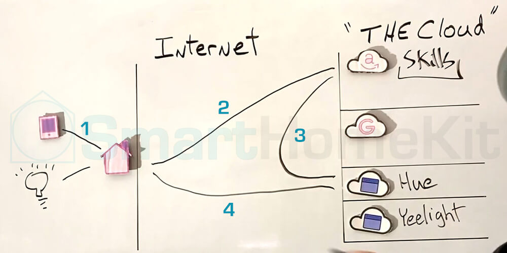 - Giai đoạn 3: Nền tảng nhà thông minh (Cloud) sẽ thực hiện nhận lệnh và truyền đến máy chủ của thiết bị con (chẳng hạn như Philips Hue, Yeelight, …).