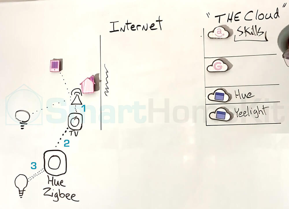 - Giai đoạn 2: HomeHub gửi lệnh qua WiFi đến bộ điều khiển trung tâm của những thiết bị con (Philips Hue Bridge hoặc Aqara Hub M2, …).